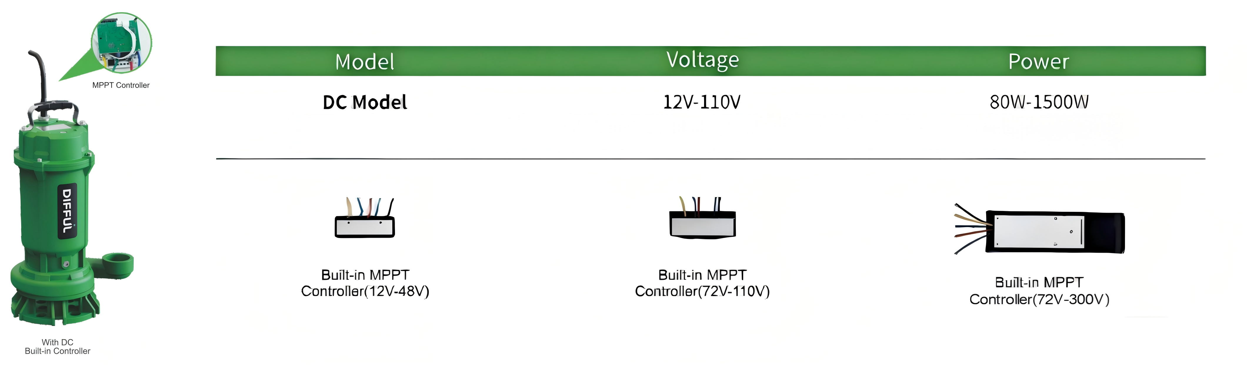 ITEM | BUILT-IN CONTROLLER MODEL | VOLTAGE | OPTIMUM INPUT VOLTAGE(DC) | POWER | MAX.FLOW | MAX.HEAD | OUTLET | CABLE | OPEN CIRCUIT VOLTAGE(VOC) | VOC(-IN MODED) |