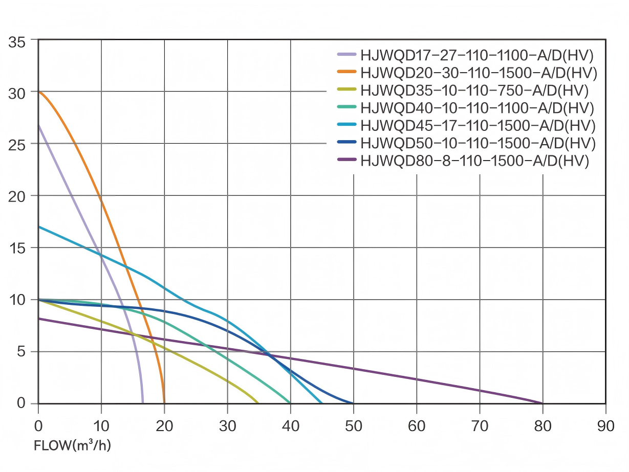 HJWQD17-27-110-1100-A/D(HV) | / | 85V-280V(/) | 100V-350V | 1100W | 17m³/h | 27m | 2″ | 5m | <450V |